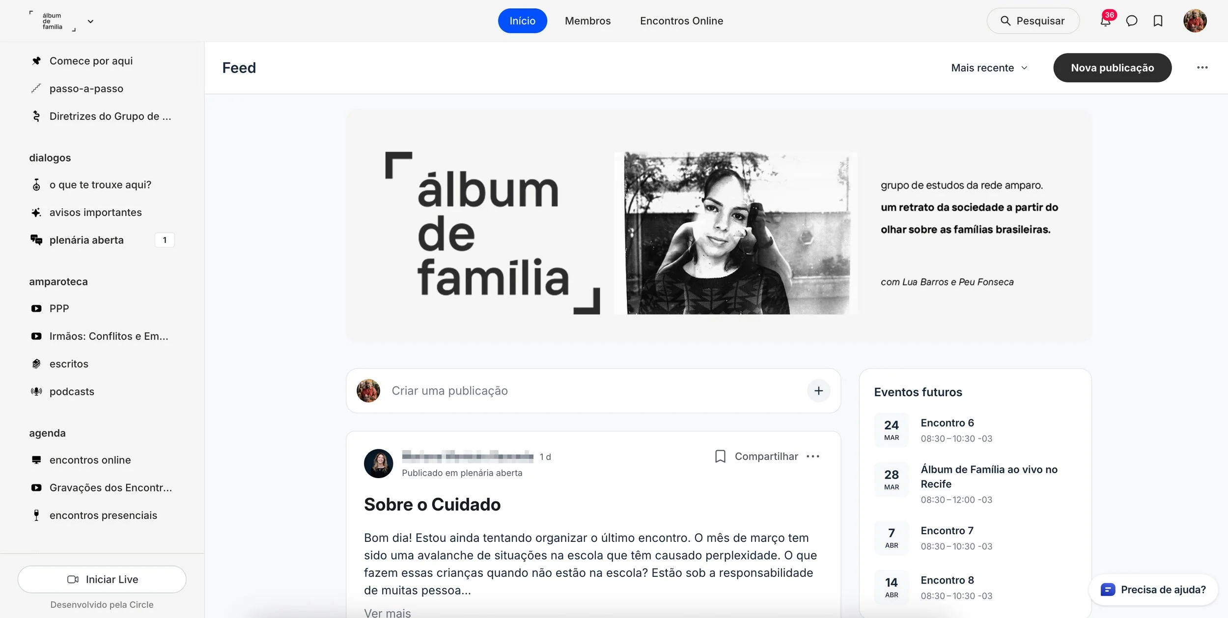 A gente dá muito valor a construção de espaços de diálogo para falar sobre a Educação Parental e sobre como ela nos ajuda em todas as relações na nossa vida. Por isso, apesar de ser um grupo de estudos online, o Álbum de Família privilegia uma dinâmica que nos humanize nesse processo. E assim criamos uma metologia que facilita o estudo e, por outro lado, nos sentimos conectadas e conectados para além da tela: a cada tema, seguimos um fluxo bem conhecido por nós.